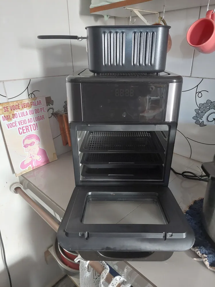 Essa airfryer é perfeita eu tô completamente apaixonada, só acho que eles tem que fazer um suporte para colocar em cima da portinha dela , ou fazer a portinha dela abrir de lado e não para baixo, pq quando vai tirar o alimento como as bandejas tem os furinhos pinga tudo na portinha, meu esposo fez pra mim um suporte de madeira então pra mim vai ficar tudo bem , não irei sujar minha portinha.